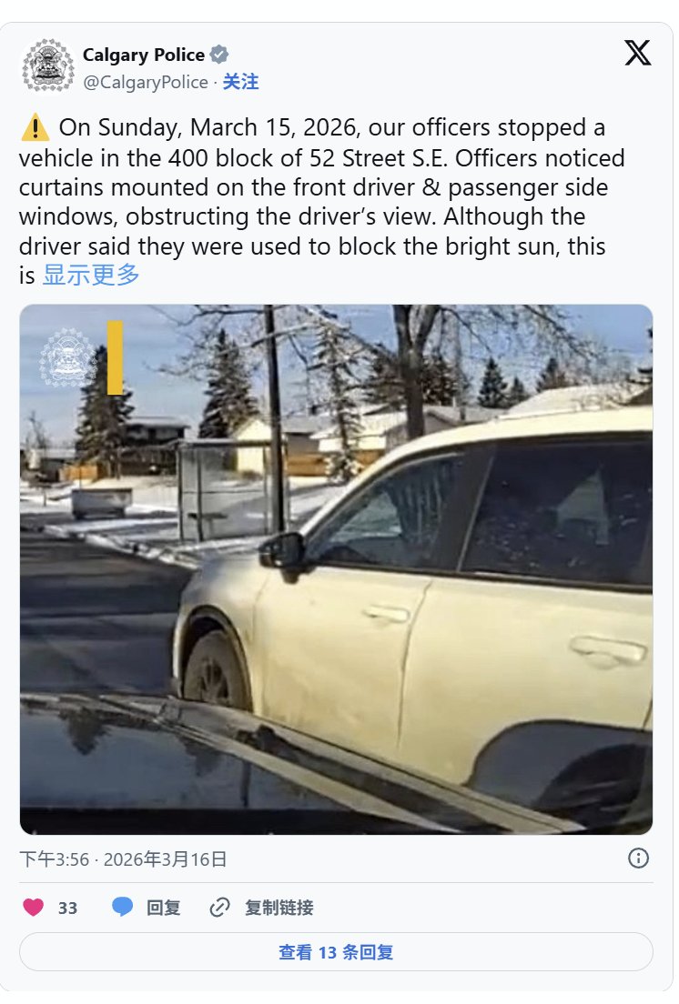 卡尔加里一名司机开车时,车窗上安装了窗帘,被警方发现后,想必尴尬不已。 周日,卡尔加里警方在东南 52 街 400 号街区拦下了一辆车,发现驾驶员侧和乘客侧车窗上安装了织物。 车主告诉警方,他们安装窗帘是为了阻挡阳光。 卡尔加里警方表示,驾驶员的视线被阻挡了。 警方在一份声明中表示:“安全驾驶意味着良好的视野和负责任的选择,以保护道路上的每一个人。” 司机被开具罚单,并被告知立即拆除窗帘。