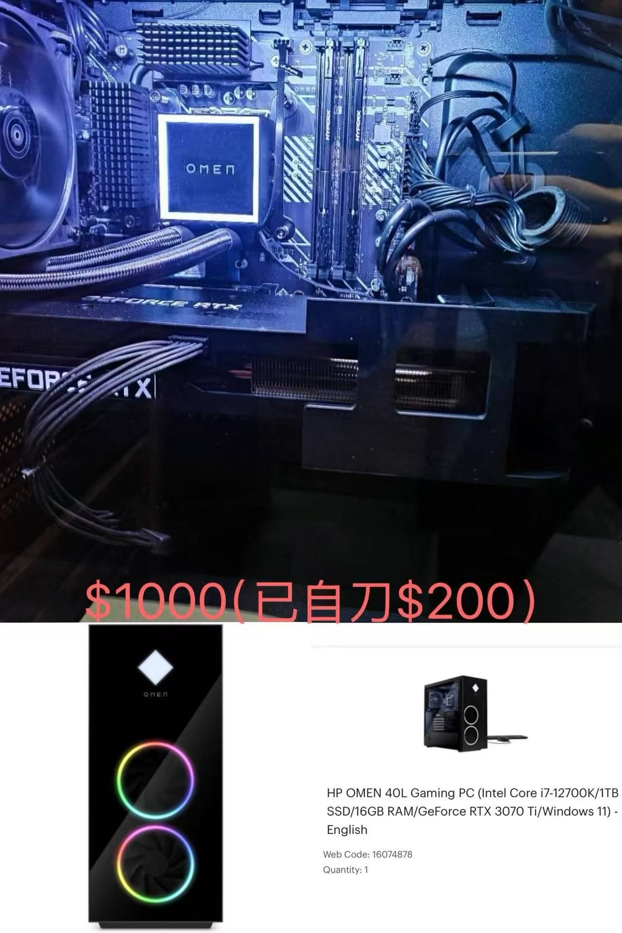 【闲置转让🖥️ 】出一台惠普暗影精灵40L 自用游戏主机 bestbuy购入整机 • CPU:i7-12700K • 内存:16GB • 固态:1TB SSD • 显卡:RTX 3070 Ti • 系统:Win11 主机卖$1000(急出已自刀$200) 诚心出 可小刀 支持上门验机 微信联系 或text:8259845712