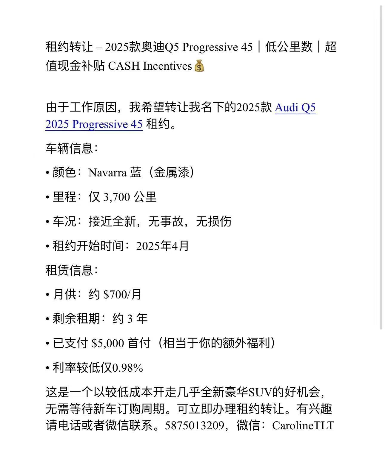 【转让】由于工作原因,转让我名下的2025款 Audi Q5 2025 Progressive 45的lease。利率低,公里数低,还有现金补贴,有意者请联系我! | 人在阿尔伯塔