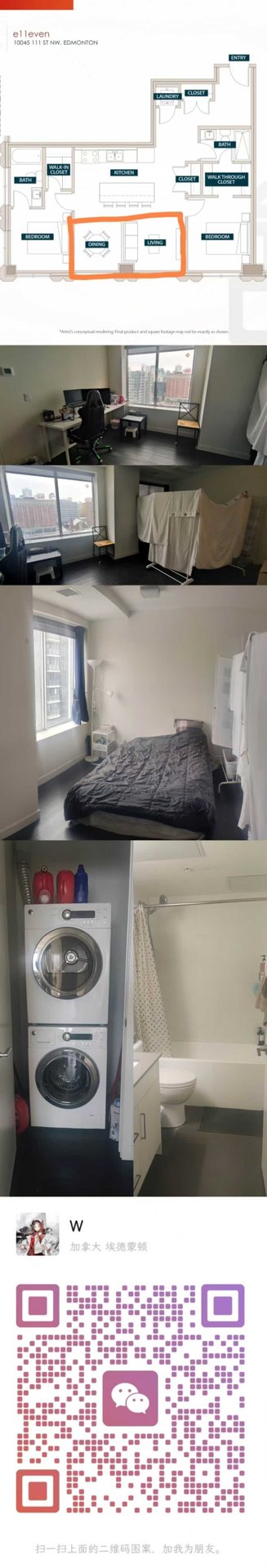 【转租】有空调和独立洗烘套装的超大客厅转租!位于Downtown的E11even的2b2b客厅转租,招女生,2026年二月中下旬/三月起可入住,具体入住时间可协商。房租622刀/月,送押金,包水暖,电网与两个室友平摊。房间已有简易隔断,家具与厨具和其他各种生活用品一起低价出(半买半送)。2026年11月底lease到期,到期可续,优先长租。 设施:好打理的全木地板,夏天可开空调。和小卧室友共用一个卫生间。套间内有免费in-suite洗衣机和烘干机,现代化厨房设施,有烤箱、微波炉、洗碗机等基础厨房电器。公寓带有免费健身房、活动室和楼顶patio。 地段:位于Downtown外缘居民区中,安静且治安较好。交通方便,步行5分钟到地铁站,坐地铁去UA只需一站5分钟。楼下公交线路多,有直通West Edmonton Mall,City Centre和学校的公交。公寓附近有Coco奶茶、云尚米线和Save on Foods超市,也有很多其他不同口味的餐馆。 室友:大卧和小卧室友都是UA的女学生,安静,好相处。希望新室友待人友善,轮流打扫卫生,保持公共区域整洁,作息规律,不在深夜大声喧哗。 转租原因:个人因工作需要搬家。 需要视频/线下看房请联系,联系方式见图。