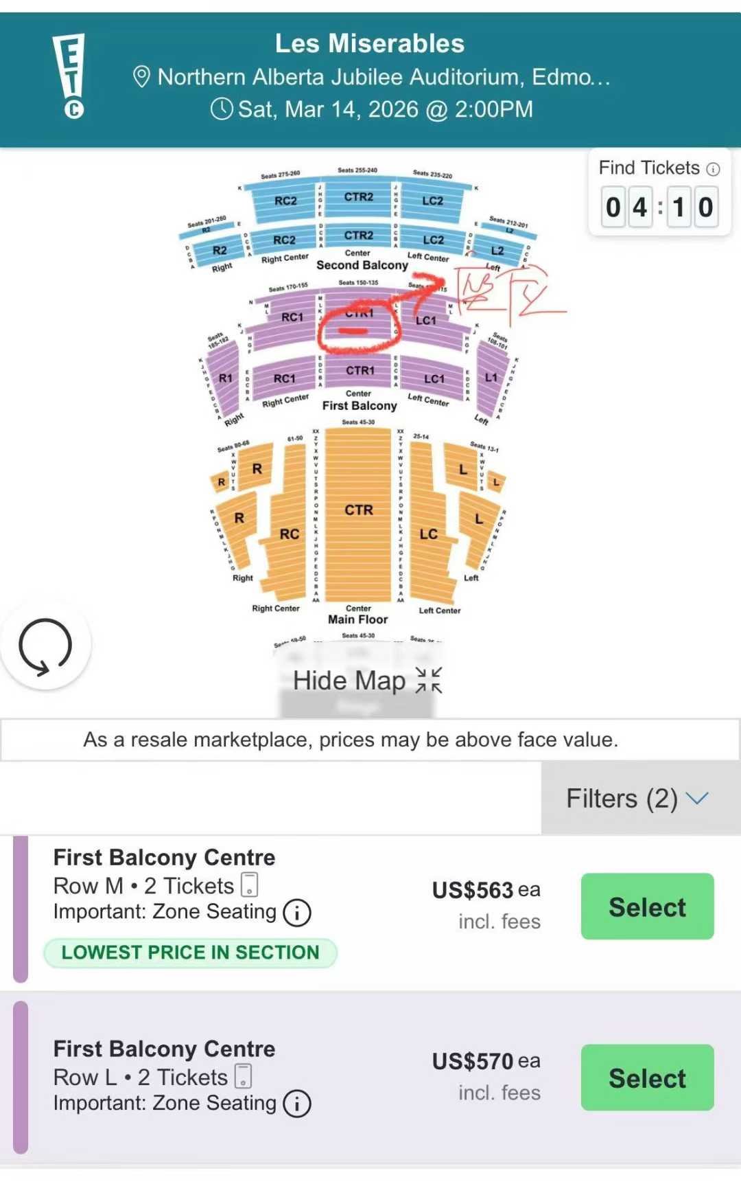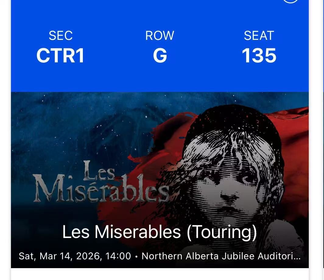 转让全球知名音乐剧《悲惨世界》门票3张连座 座位: CTR 1 二楼正中靠前排,俯视舞台、声音最好,黄金听视觉(Chat GPT)。 时间:2026年3月14日 下午2时 地点:Northern Alberta Jubilee Auditorium 目前全网最低很低价出售,3张联票共900刀转让,免手续费
