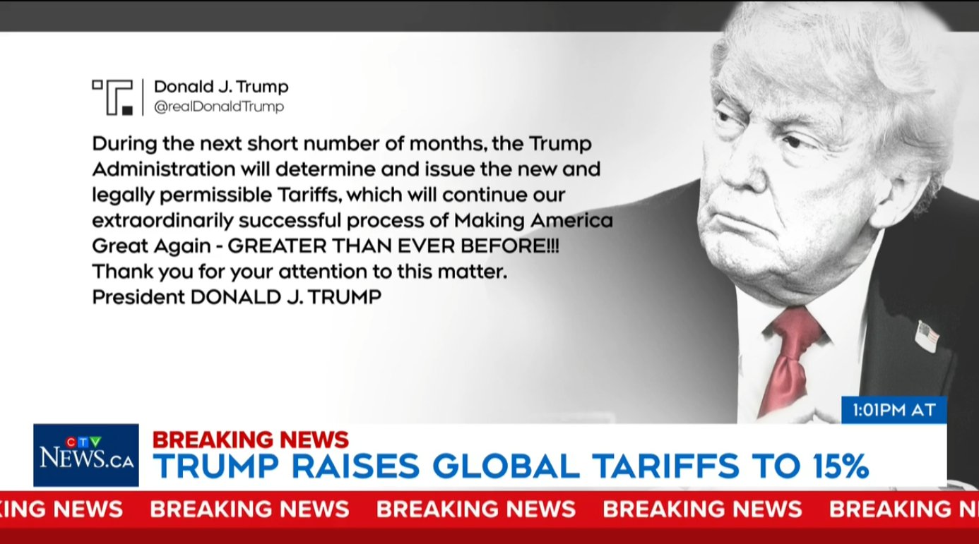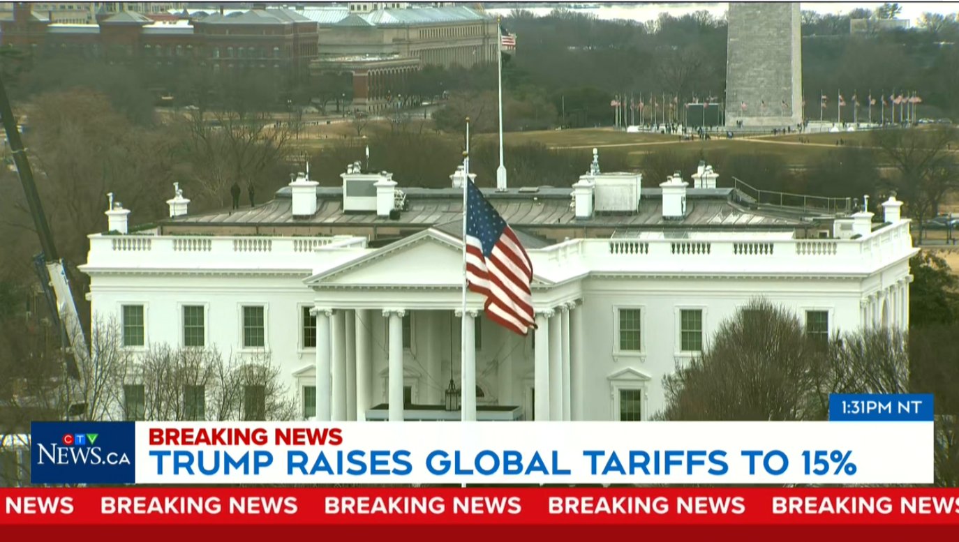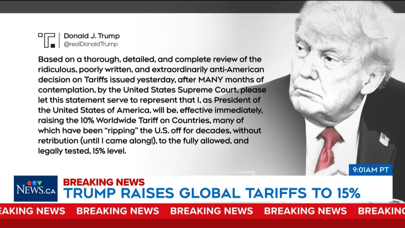 在美国最高法院裁定其部分关税措施违法后,特朗普周六表示,计划将新的全球统一关税提高至 15%。 特朗普在社交媒体发文称,未来几个月内,政府将制定并实施“合法允许的新关税”。 周五签署行政命令 依据《1974年贸易法》第122条 自下周二起实施 10%全球统一关税 最高可升至 15% 若国会不延长,将在 150天后到期 符合《加美墨协定》(CUSMA)的商品不受影响 钢铁、铝和汽车等行业性关税不叠加 美国最高法院周五裁定,特朗普不能依据《国际紧急经济权力法》(IEEPA)征收所谓“解放日”关税以及针对加拿大、墨西哥和中国的芬太尼相关关税。 特朗普称该裁决“措辞拙劣且极端反美”。 法院裁决限制了总统在紧急权力法下随时对任何国家征收高额关税的能力,但并未完全阻止其通过其他法律工具调整贸易政策。 美国贸易代表表示,政府将依据《1974年贸易法》第301条,对相关国家展开调查。 第301条允许总统在调查认定贸易伙伴存在不合理或歧视性做法时采取贸易行动,但流程通常需要数月,并包含公众意见征询阶段。 对加拿大影响 对加拿大经济的直接影响预计有限 但在今年CUSMA强制性审查前,贸易不确定性将增加