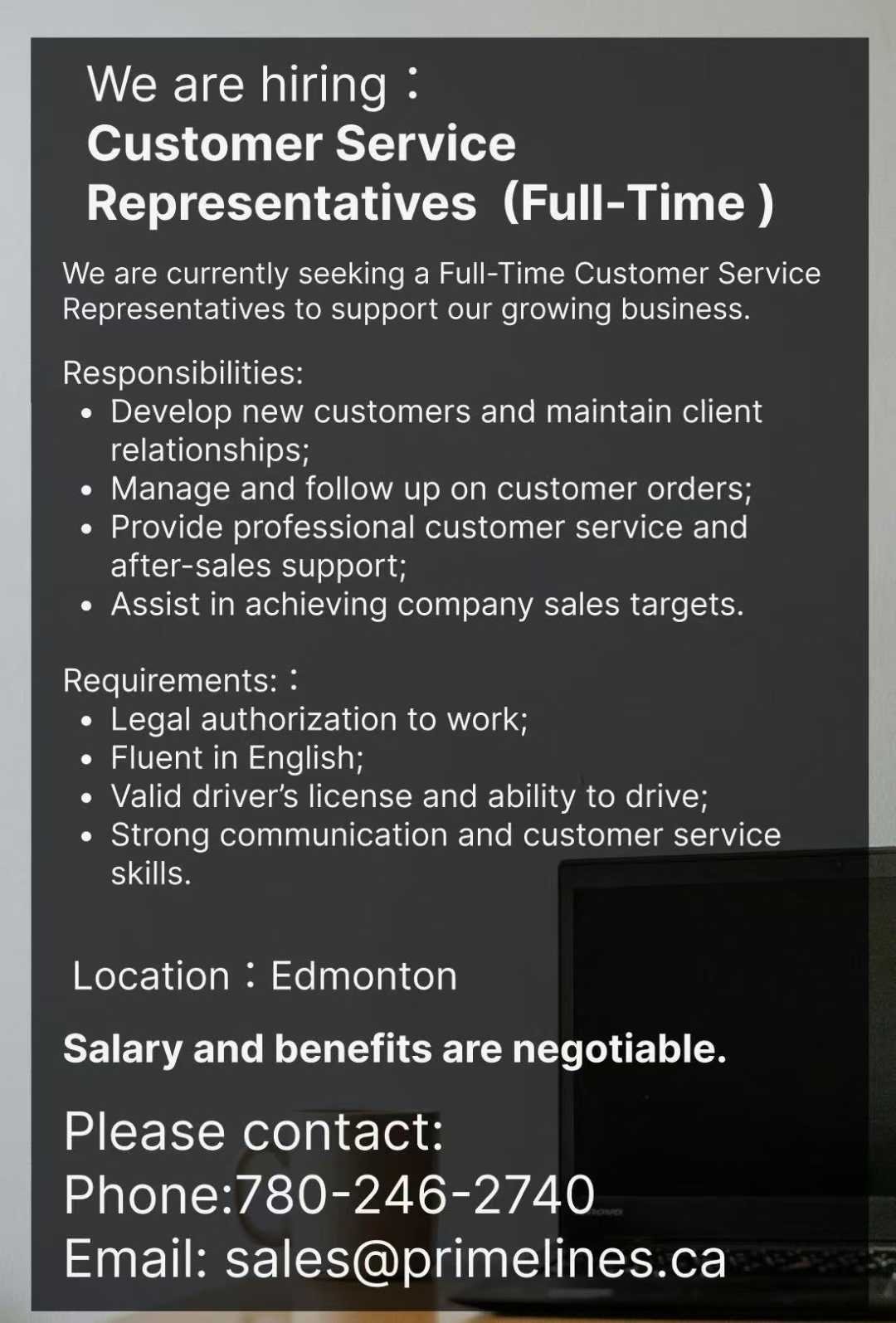 【招聘👨🏻 】We are hiring: Customer Service Representatives (Full-Time) We are currently seeking a Full-Time Customer Service Representatives to support our growing business. Responsibilities: Develop new customers and maintain client relationships; Manage and follow up on customer orders; Provide professional customer service and after-sales support; Assist in achieving company sales targets. Requirements: . Legal authorization to work; Fluent in English; . Valid driver's license and ability to drive; Strong communication and customer service skills. Location :Edmonton Salary and benefits are negotiable. Please contact: Phone:780-246-2740 Email:sales@primelines.ca