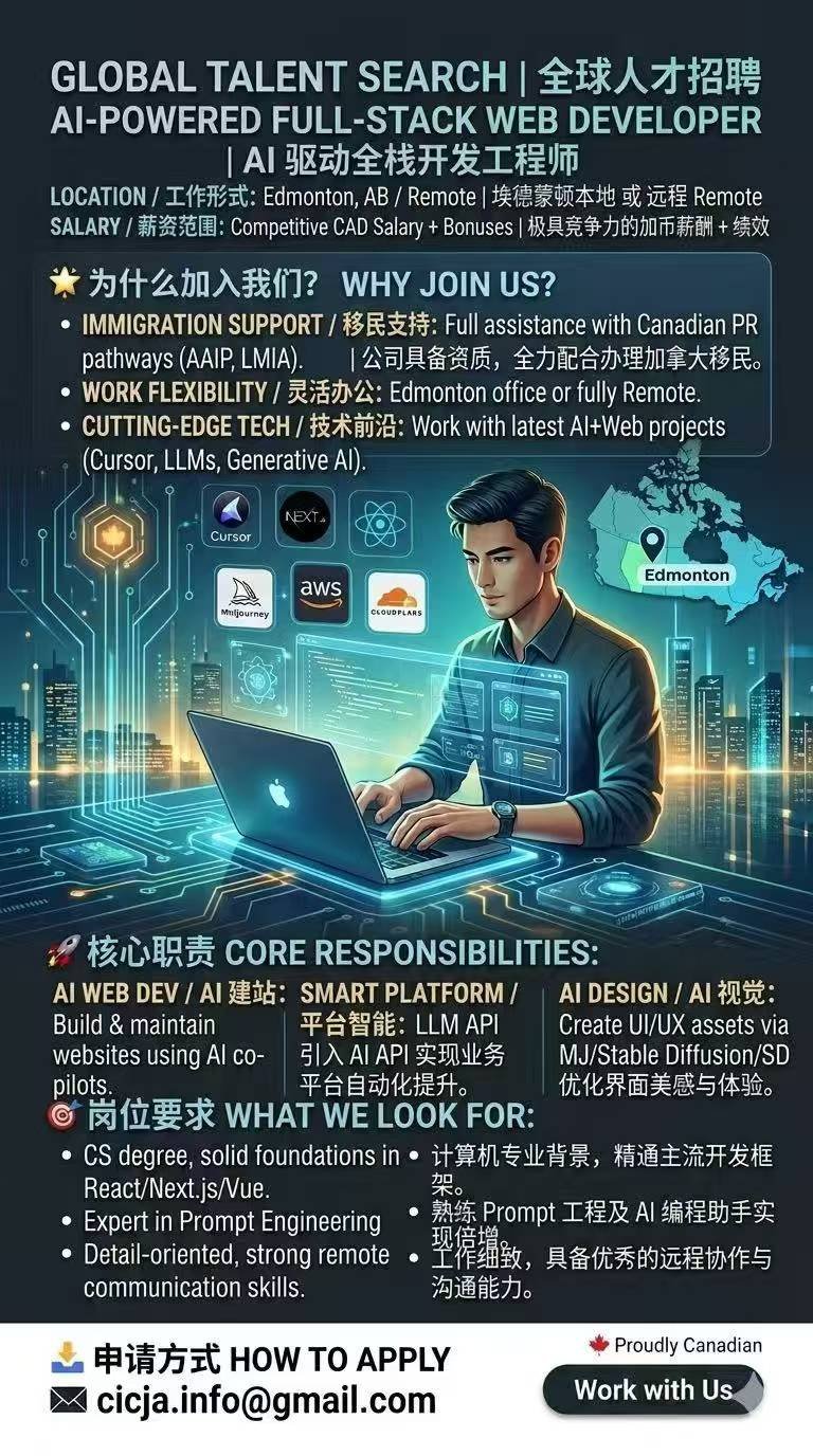 【招聘👨🏻 】招聘职位:AI 驱动的全栈开发工程师 (Full-Stack AI Developer) 工作形式: 全职(埃德蒙顿本地 或 远程 Remote) 薪资范围: 极具竞争力的加币薪酬 + 项目绩效 🌟 为什么加入我们? 我们不只是在招聘一名技术员,我们是在寻找一位能够利用 AI 工具实现效率革命 的合作伙伴。你将跳出重复造轮子的传统开发模式,直接站在 AI 的肩膀上进行创造。 • 移民支持: 公司拥有完善的雇主担保资质。对于表现优异的候选人,我们将全程协助办理加拿大移民(如 AAIP省优势移民计划、LMIA 等)。 • 埃德蒙顿/远程灵活切换: 你可以选择在埃德蒙顿办公室与团队碰撞,也可以在任何地方远程办公。 • 技术前沿: 深度参与 AI + Web 的实战项目,保持技术不掉队。 🚀 你的核心职责: 1. AI 高效建站与维护: • 利用 Cursor, v0.dev, Bolt.new 等 AI 编程助手,快速完成高质量官网及客户网站的搭建。 • 负责网站的后期安全维护、SEO 优化及性能监控,确保系统 99.9% 的稳定性。 2. 业务平台智能化迭代: • 参与内部业务平台的开发,引入 LLM(大语言模型)API 提升平台自动化处理能力。 3. AI 视觉与体验设计: • 熟练运用 Midjourney, Stable Diffusion 或 Flux 等工具,为网站生成高水准的视觉素材,提升 UI/UX 的美感与用户转化率。 🎯 我们希望你是: • 技术扎实: 计算机相关专业毕业,熟悉 React / Next.js / Vue 等主流前端框架及后端逻辑。 • AI 开发原住民: 你能熟练展示如何利用 Prompt Engineering 和 AI 编程工具将开发效率提升 3-5 倍。 • 全链路思维: 能够独立负责从域名解析、服务器部署(AWS/Vercel/Cloudflare)到前端实现的全过程。 • 责任心与沟通: 工作细致,能通过远程协作工具与团队保持高效沟通。