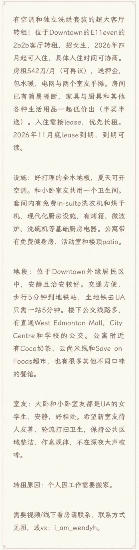 【转租】有空调和独立洗烘套装的超大客厅转租!位于Downtown的E11even的2b2b客厅转租,招女生,2026年四月起可入住,具体入住时间可协商。房租542刀/月(可再议),送押金,包水暖,电网与两个室友平摊。房间已有简易隔断,家具与厨具和其他各种生活用品一起低价出(半买半送)。入住需接lease,优先长租。2026年11月底lease到期,到期可续。 设施:好打理的全木地板,夏天可开空调。和小卧室友共用一个卫生间。套间内有免费in-suite洗衣机和烘干机,现代化厨房设施,有烤箱、微波炉、洗碗机等基础厨房电器。公寓带有免费健身房、活动室和楼顶patio。 地段:位于Downtown外缘居民区中,安静且治安较好。交通方便,步行5分钟到地铁站,坐地铁去UA只需一站5分钟。楼下公交线路多,有直通West Edmonton Mall,City Centre和学校的公交。公寓附近有Coco奶茶、云尚米线和Save on Foods超市,也有很多其他不同口味的餐馆。 室友:大卧和小卧室友都是UA的女学生,安静,好相处。希望新室友待人友善,轮流打扫卫生,保持公共区域整洁,作息规律,不在深夜大声喧哗。 转租原因:个人因工作需要搬家。 需要视频/线下看房请联系,联系方式见图,或vx:i_am_wendyh。