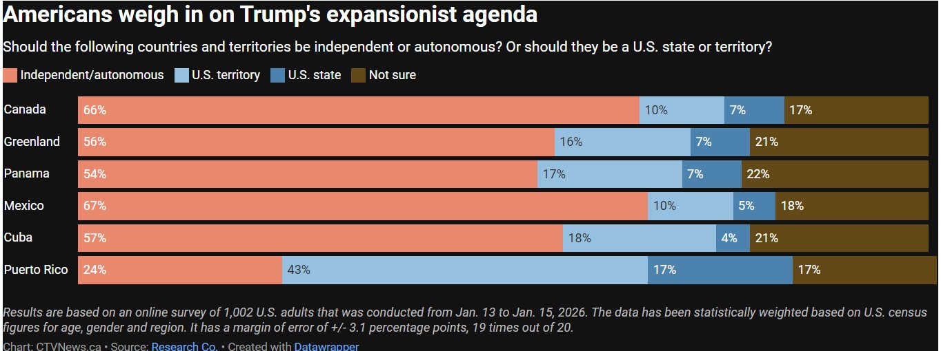 一项最新民意调查显示,大多数美国人并不支持加拿大或格陵兰成为美国的一部分,而是希望两者保持现有的独立或自治地位。 这项线上调查由温哥华的民调机构 Research Co. 进行,调查时间为 1 月 13 日至 15 日,共访问 1,002 名美国成年人。 66% 的受访者支持 加拿大继续作为独立国家 56% 支持 格陵兰维持丹麦自治领地地位 仅 17% 希望加拿大成为美国的州或领土 23% 认为格陵兰应成为美国的州或领土 在 Donald Trump 第二任期内,他多次公开表达希望加拿大成为“美国第 51 个州”,并以国家安全为由,提出将格陵兰纳入美国版图的构想。 尽管如此,调查发现: 即便在特朗普支持者中,也没有形成多数支持 仅 36% 的特朗普支持者 赞成格陵兰成为美国的州或领土 民调负责人表示,美国社会并不存在一个强烈要求“扩张版图”的主流声音。 调查还询问了受访者对 古巴、巴拿马、墨西哥和波多黎各 地位的看法: 多数美国人支持 古巴、巴拿马和墨西哥保持独立 对波多黎各: 43% 支持维持现状 24% 支持独立 17% 支持成为美国州 该调查误差范围为 ±3.1%。