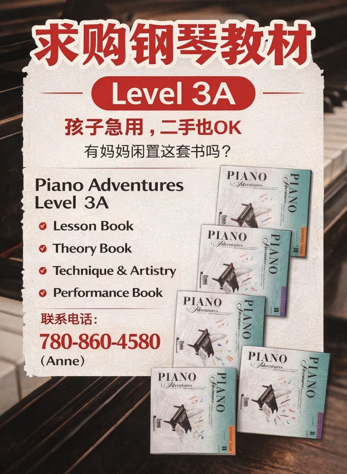 有没有妈妈家里闲置这套书? 📚 Piano Adventures Level 3A: ✔️ Lesson Book ✔️ Theory Book ✔️ Technique & Artistry ✔️ Performance Book 有的话请联系: 📱 780-860-4580 (Anne)